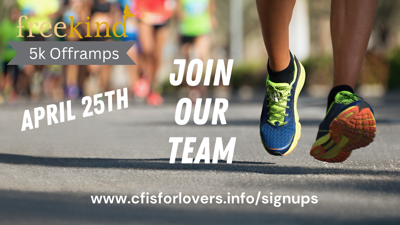 We are excited to put together a CF team. Using the button below, register to join our team. Enter your info, t-shirt size, and select CF is for lovers when prompted to join a team.